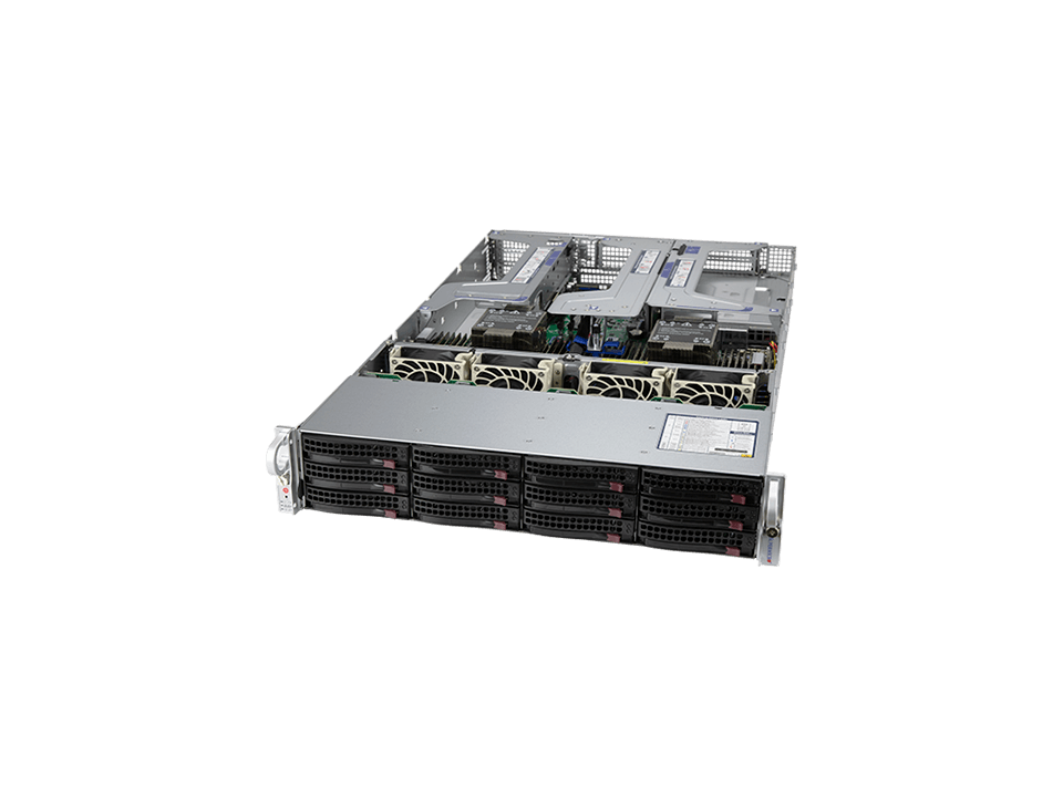 - 12 front hot-swap 3.5″ NVMe/SAS*/SATA drive bays
