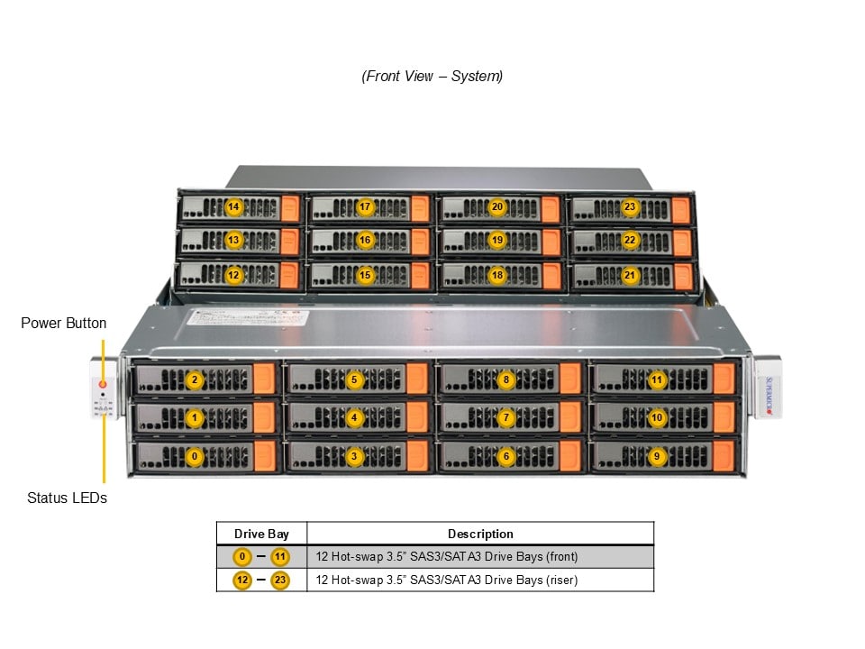 - Option B: Total 30 bays12 front hot-swap 3.5″ SAS/SATA drive bays 12 top-loading hot-swap 3.5″ SAS/SATA drive bays 4 rear hot-swap 2.5″ NVMe drive bays 2 rear hot-swap 2.5″ SATA drive bays