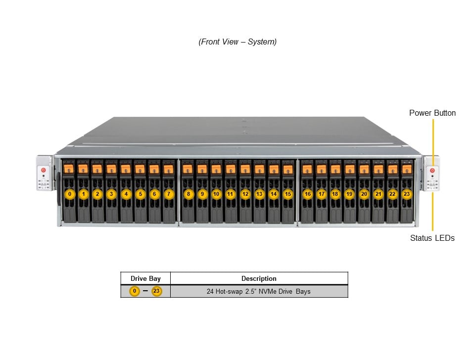 - Default: Total 24 bays24 front hot-swap 2.5″ PCIe 5.0 NVMe drive bays