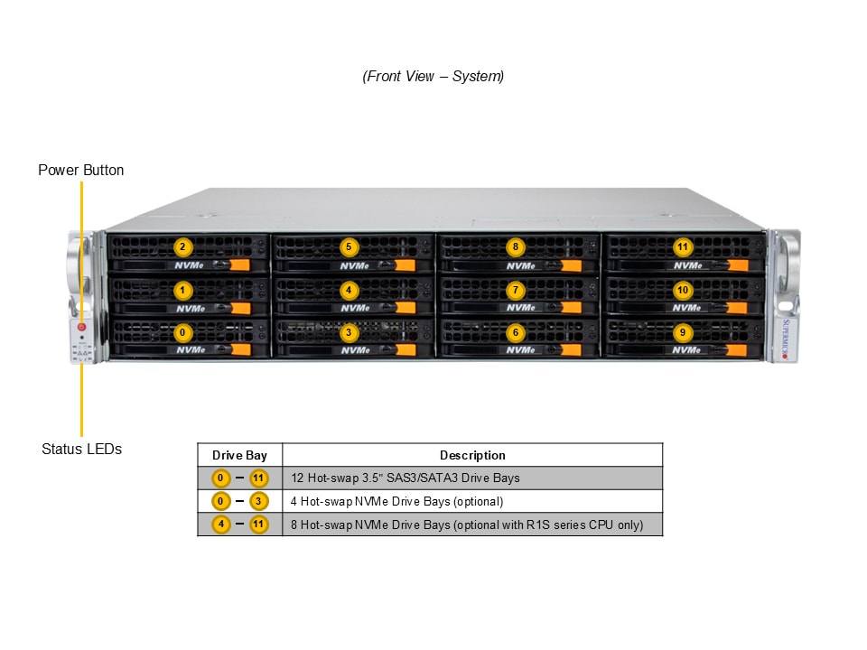 - 12 front hot-swap 3.5″ NVMe*/SAS/SATA drive bays
