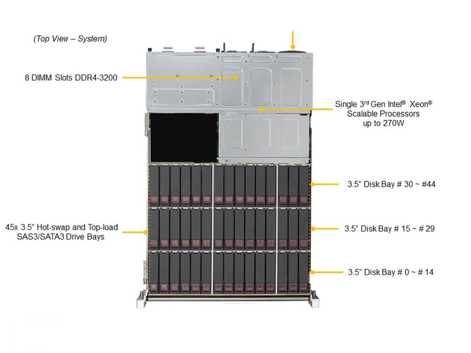 - 45 top-loading hot-swap 3.5″ SAS/SATA drive bays