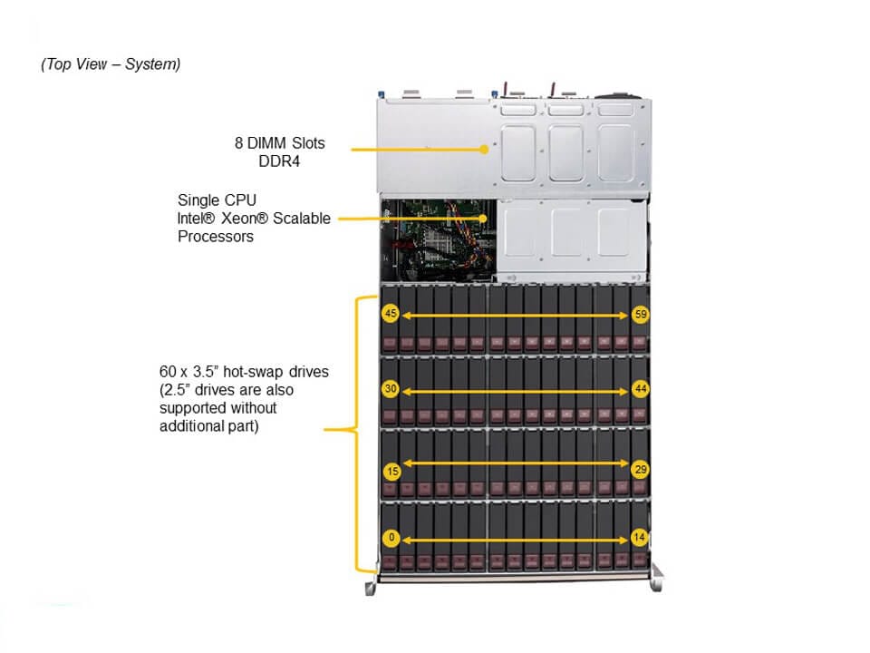 - 60 top-loading hot-swap 3.5″ SAS/SATA drive bays