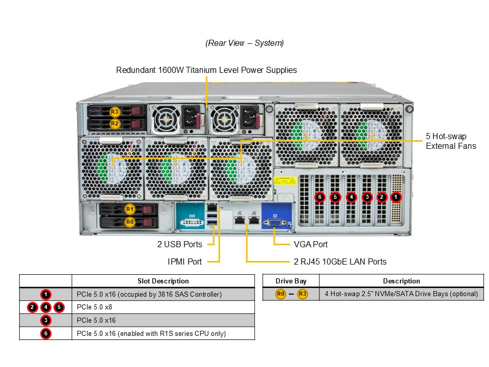 • 4 rear hot-swap 2.5″ PCIe 5.0 x8 NVMe* drive bays