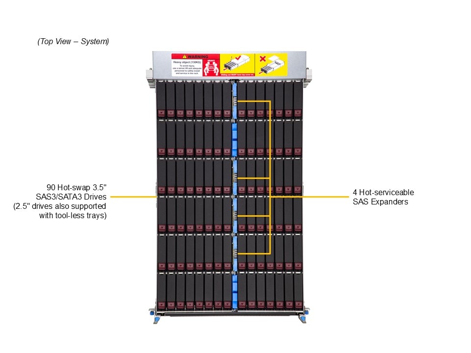 - Default: Total 90 bays90 top-loading hot-swap 3.5″/2.5″ SAS/SATA drive bays
