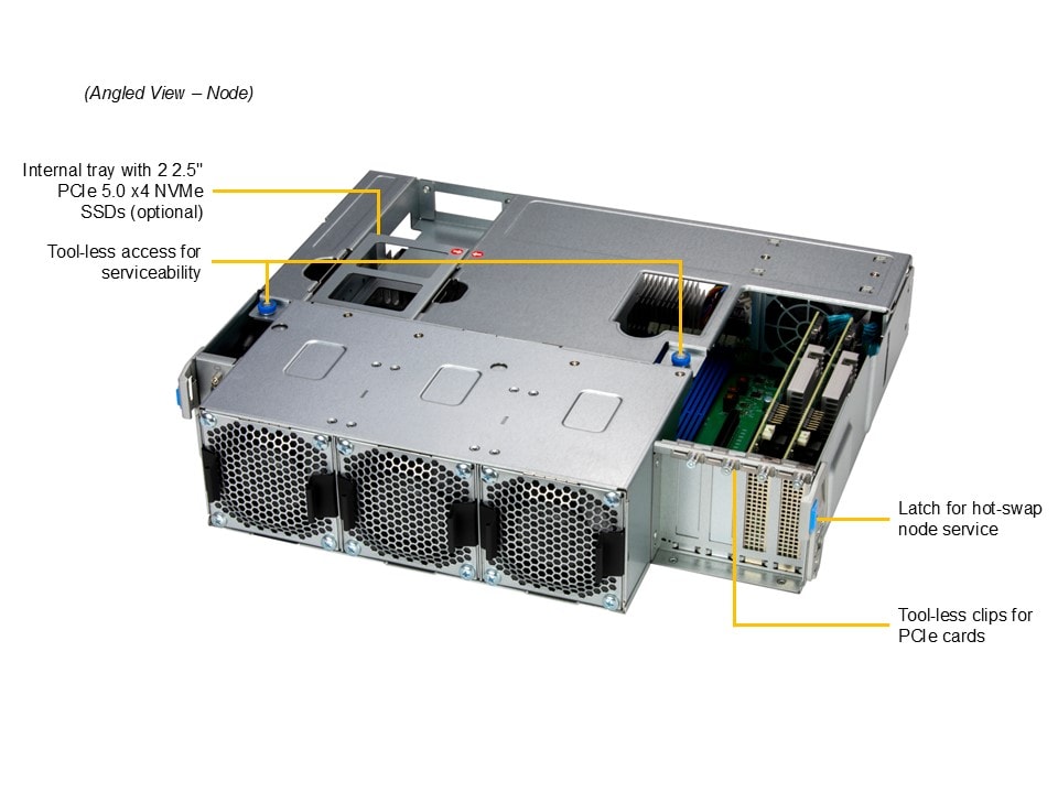 - 2 internal fixed 2.5″ PCIe 5.0 x4 NVMe* drive bays