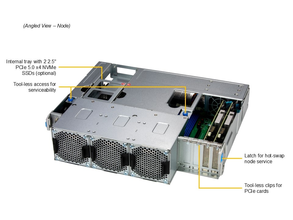 - 2 internal fixed 2.5″ PCIe 5.0 x4 NVMe* drive bays