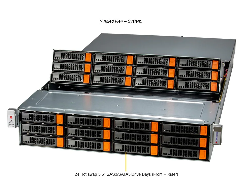 - 12 top-loading hot-swap 3.5″ SAS/SATA drive bays