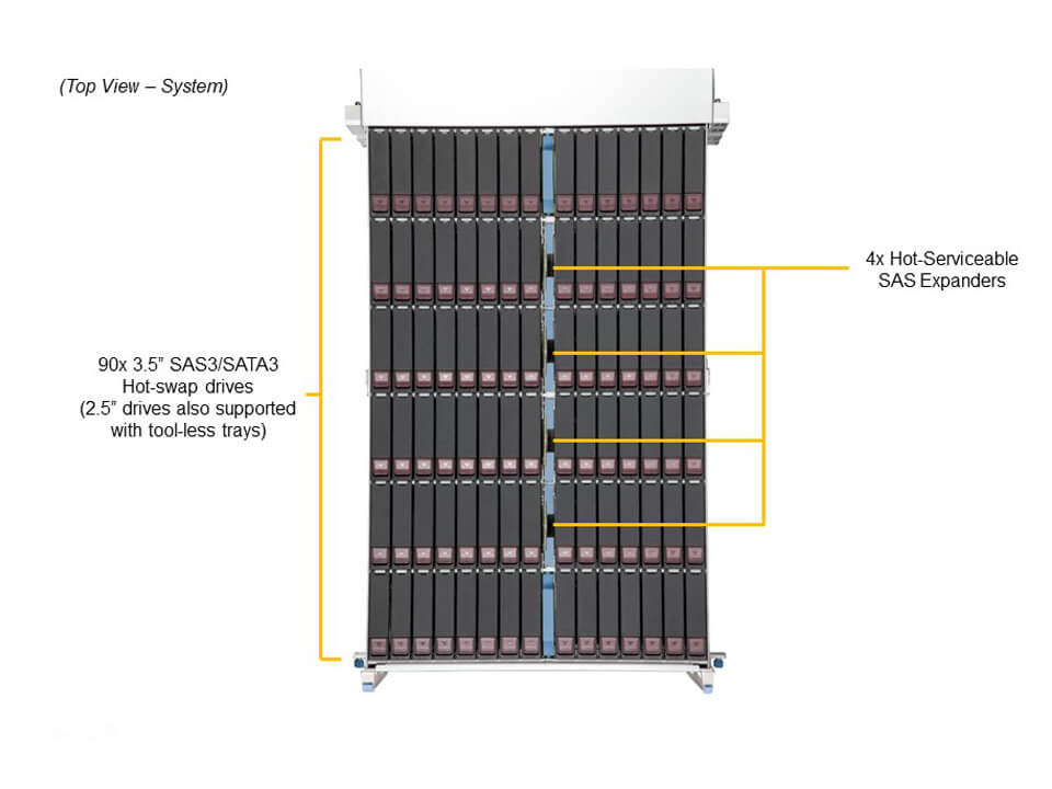 - 90 3.5″/2.5″ Hot-swap SAS3/SATA3 drives (Each node controls 45 drives)