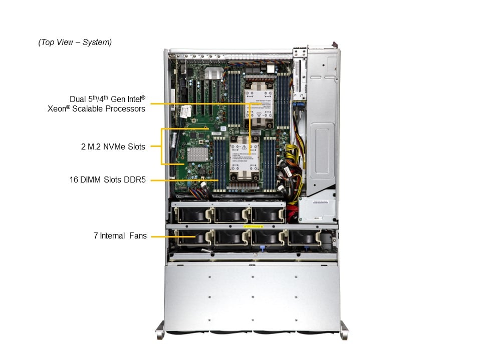 - 6 front hot-swap 3.5″ PCIe 5.0 x4 NVMe* drive bays