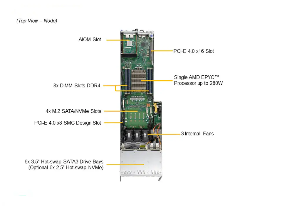 - 2 front hot-swap 2.5″ NVMe/SATA drive bays