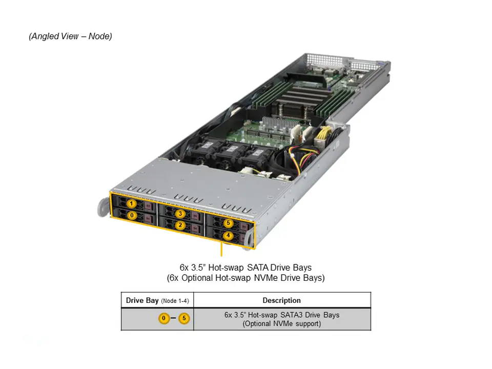 - Default: Total 6 bays2 front hot-swap 2.5″ NVMe/SATA drive bays 4 front hot-swap 2.5″ NVMe*/SATA drive bays