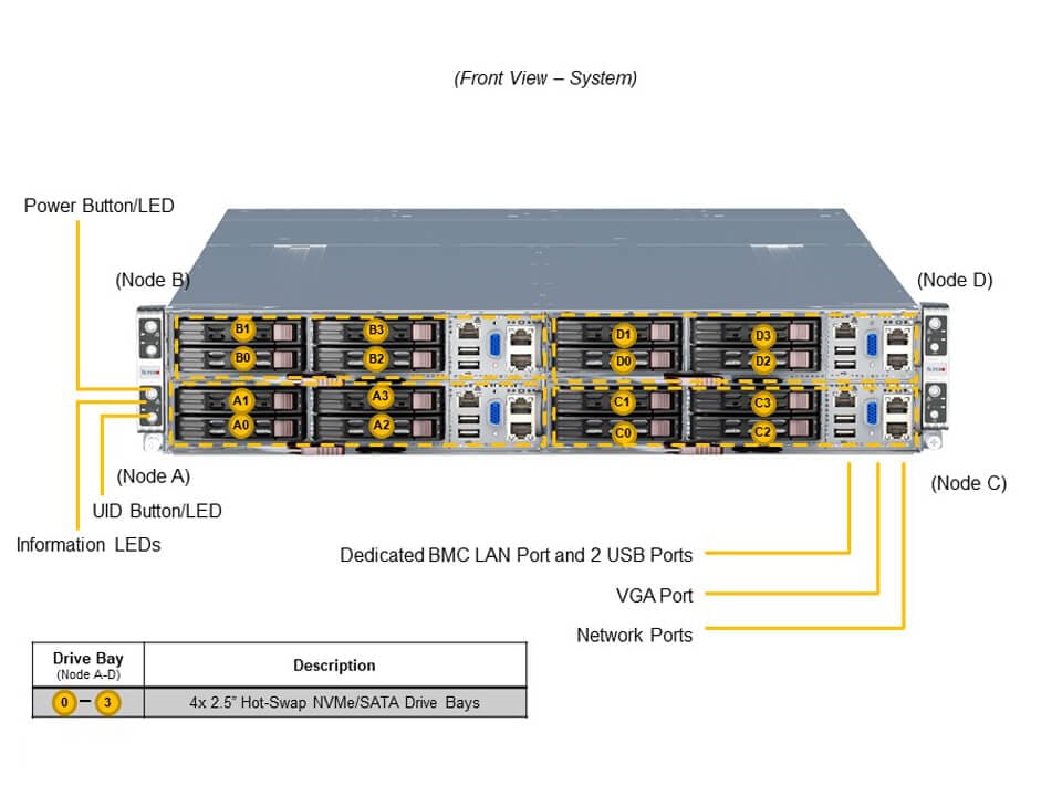 - 4 front hot-swap 2.5″ NVMe/SATA drive bays