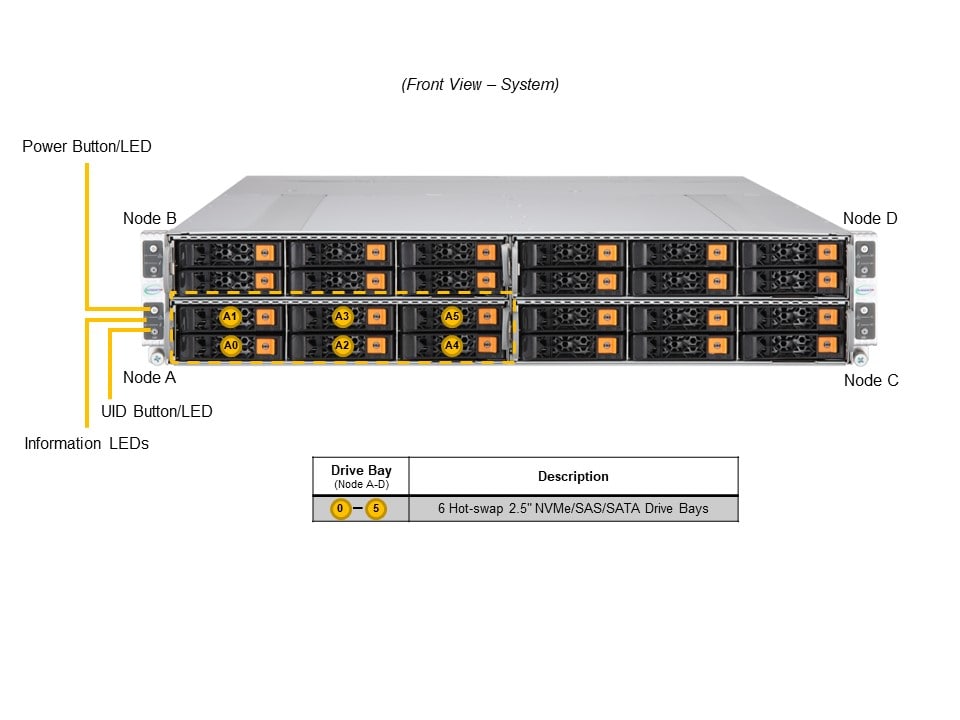 - Default: Total 6 bays6 front hot-swap 2.5″ NVMe/SAS/SATA drive bays