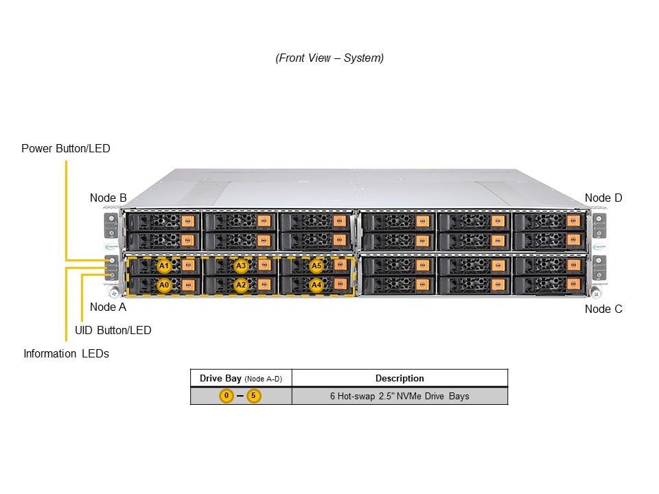 • Default: Total 6 bays6 front hot-swap 2.5″ PCIe 5.0 x4 NVMe drive bays