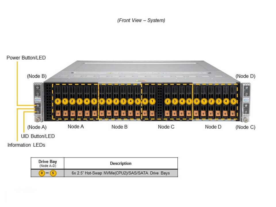 - 6 Hot-swap 2.5″ drive bays; 6 PCIe 4.0 NVMe/SAS/SATA 2.5″ drives