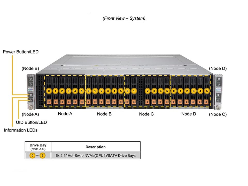 - 6 Hot-swap 2.5″ drive bays; 6 PCIe 4.0 NVMe/SATA 2.5″ drives