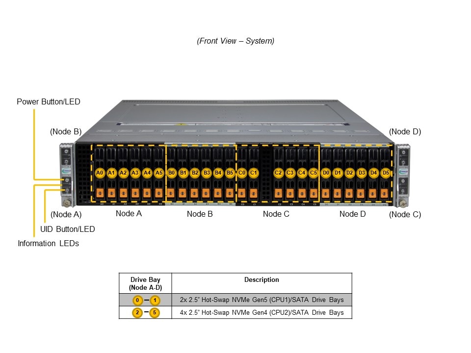 • Default: Total 6 bays2 front hot-swap 2.5″ PCIe 5.0 NVMe/SATA drive bays 4 front hot-swap 2.5″ PCIe 4.0 NVMe/SATA drive bays