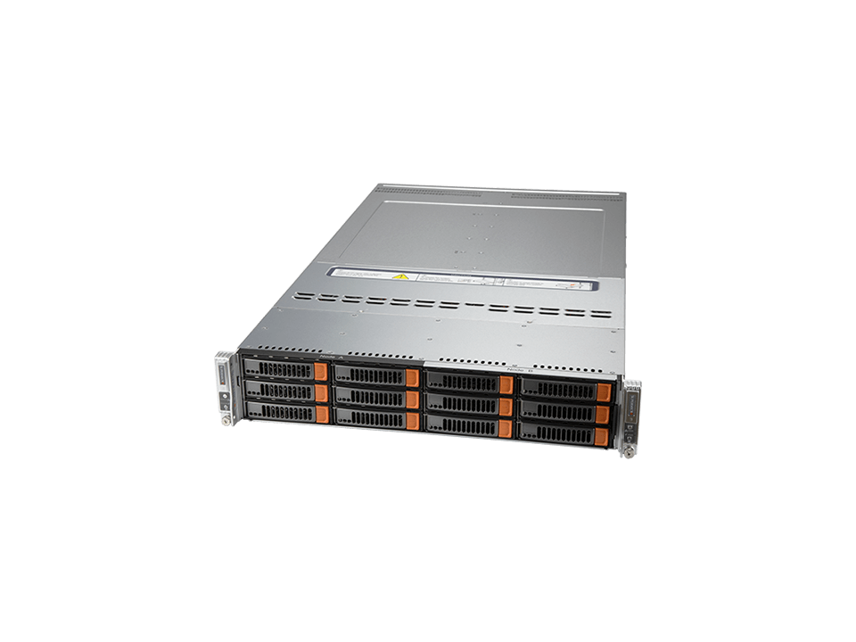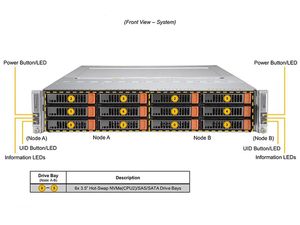 2U 2-node BigTwin with 6 3.5″ NVMe/SAS/SATA bays per node