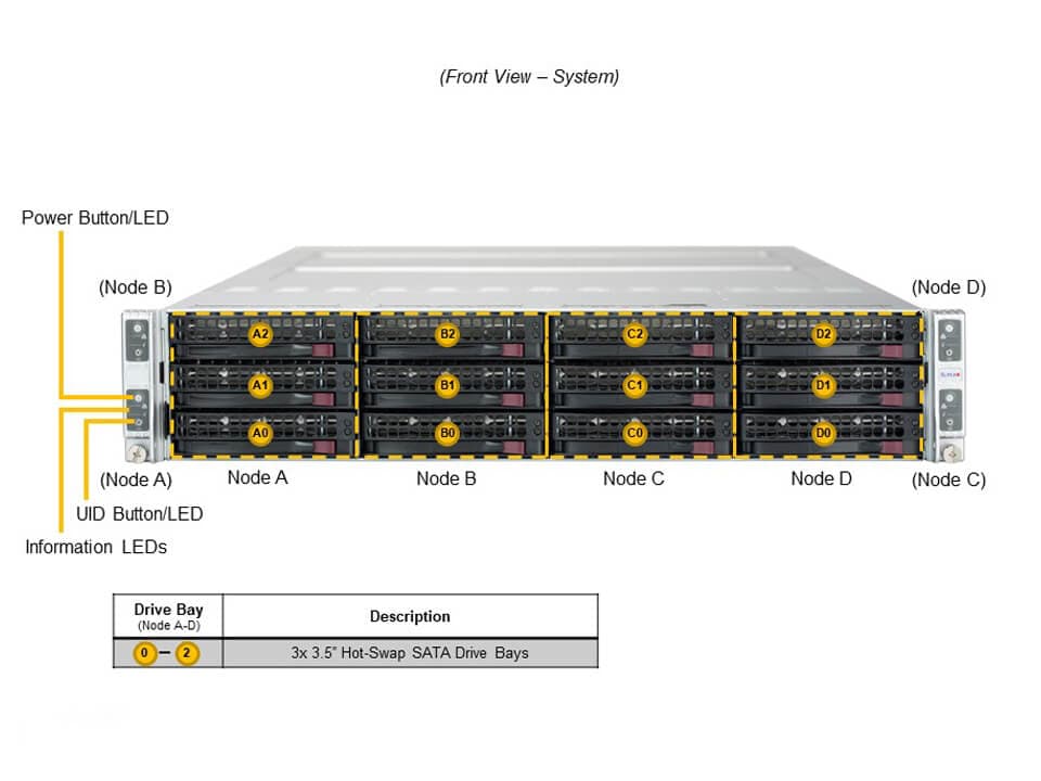 - Default: Total 3 bays3 front hot-swap 3.5″ SATA drive bays