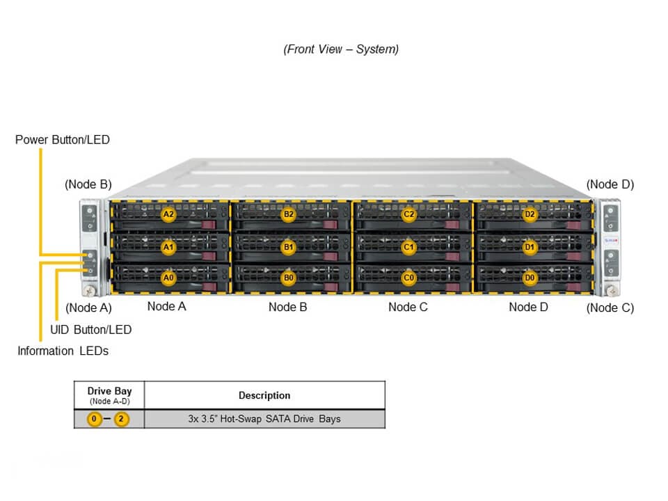 - Default: Total 3 bays3 front hot-swap 3.5″ SATA drive bays