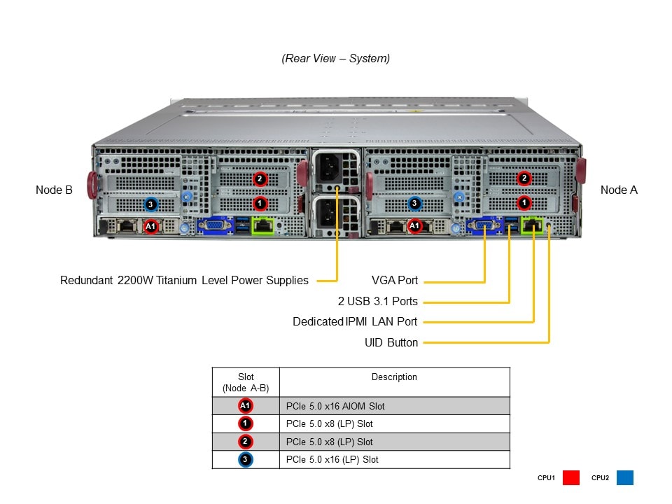 - 2 front hot-swap 3.5″ PCIe 5.0 NVMe/SAS drive bays