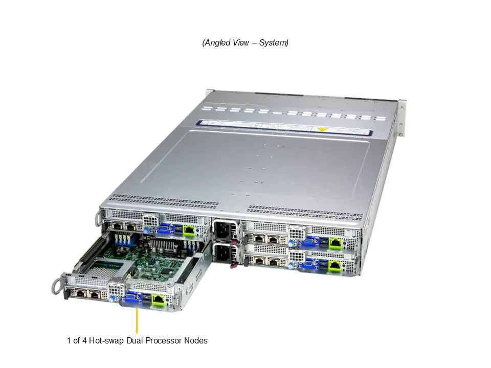 2U 4-Node BigTwin with 3 hot-swap 3.5″ NVMe/SAS/SATA drives per node