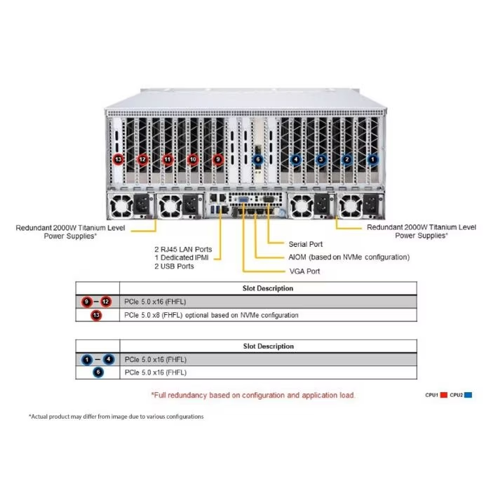 Equipped with bigger, faster storage options featuring 24 hot-swap 2.5″ NVMe/SATA/SAS drive bays providing superior storage capabilities to easily execute intensive data processing and workloads. The AS -4125GS-TNRT SuperServer is powered by four 2000W redundant titanium power supplies, giving you one of the most reliable and efficient GPU servers available today.